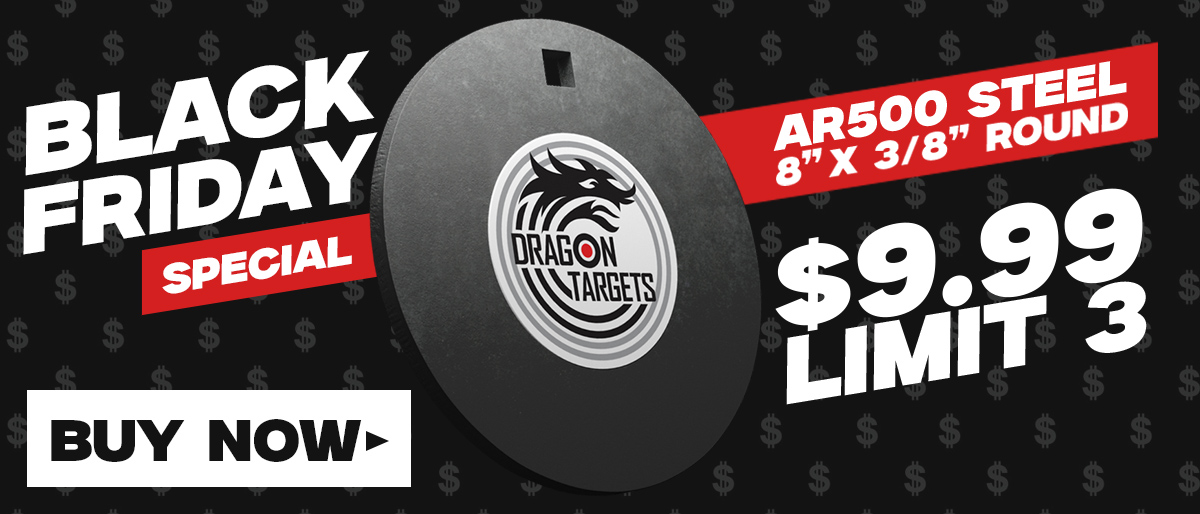 SALE Quick view Details Dragon Targets | sku: 610-1721RAWRD Black Friday 8" x 3/8" Raw Round AR500 Steel Shooting Target MSRP: Was: $29.99 Now: $9.99 Add to Cart